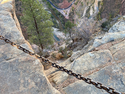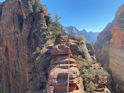 Zion has plenty of trails, but Angels Landing may be the most breathtaking. Picture this. You begin the hike on the wide and well-maintained West Rim Trail. It follows the river and then crosses the bottom of the canyon, surrounded by 270 million year old layers of rock. Relaxing, right? Just wait for it. The trail then starts to climb via a series of switchbacks leading up the side of the mountain. Then more switchbacks: 21 tighter turns, called “Walter’s Wiggles,” where elevation levels rapidly increase. Your heartbeat is probably rapidly increasing at this point, too.