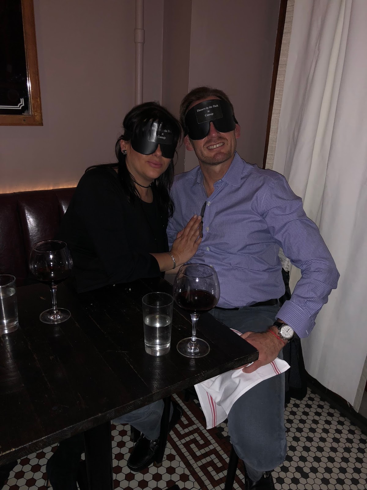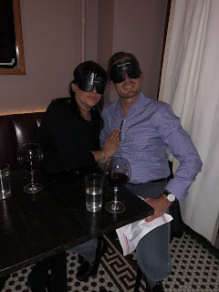 My wife and I went to Dinner in the Dark, a dinning experience held in a small restaurant in the West Village where all guests are fully blindfolded throughout the two hour adventure. All guests gathered outside the restaurant by 7 PM. There were around 30 people in total. They called out our names and took us inside in groups of 4. We were asked to put on a very comfortable blindfold outside and hold the shoulder of the person in front of us as we were lead inside. It was still light out at the time but the blindfold was 100% effective.